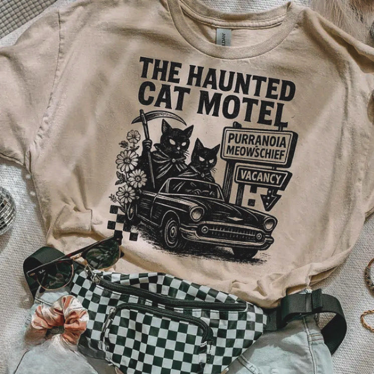 Haunted Cat Motel Tee - Small is backordered and will ship as soon as it is back in stock.